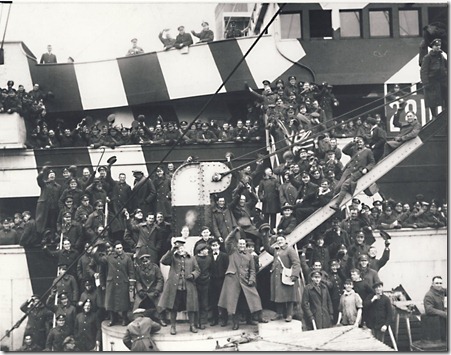 Soldados canadenses (na época o Canadá era uma colônia britânica) embarcando no Olympic indo de volta para a terra natal, em 1918, no fim da I Guerra Mundial. Perceba que um dos oficiais leva uma bandeira.